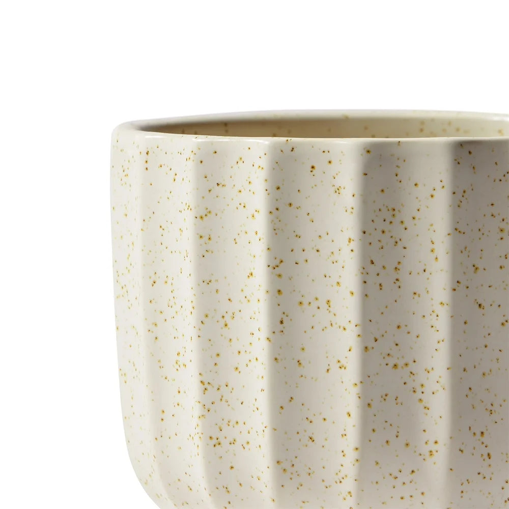 Introducing our versatile 4. 5”H Ceramic Pot, a charming addition to your indoor greenery. Crafted from durable ceramic in a soothing cream white hue, this pot boasts a soft smooth finish that adds a touch of elegance to any space. Featuring a unique vertical ribbed texture and delicate dotted speckles, it exudes understated sophistication while complementing various decor styles seamlessly. Whether displaying vibrant flowers, lush plants, or standing alone as a decorative accent, this timeless piece elevates your home decor effortlessly. Rest assured, its sturdy and well-made construction ensures stability and prevents tilting. Enhance your living space with this stylish and functional ceramic pot that brings natural beauty indoors.