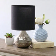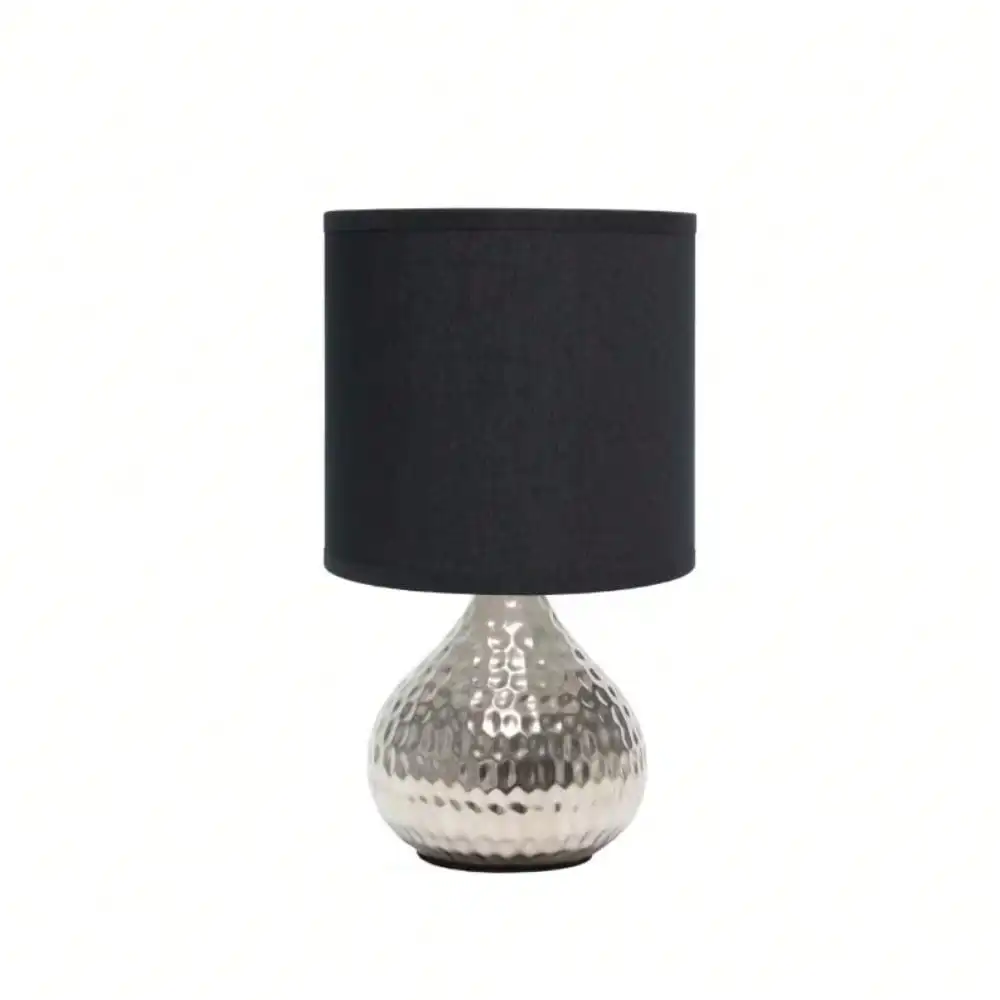 About This Product A stunning hammered metallic base is the trademark for this stylish table lamp. With a fabric drum shade to compliment the pear shaped base, this lamp is designed to sit perfectly atop your furniture of choice. Simple yet exquisite, this lamp is everything you're missing in your home. Highlights Hammered silver metal base Fabric black shade Uses 1 x 40-Watt type B candelabra based bulb (not included) Easily accessible on/off switch located on the cord Shade measures: Dia: 5.13 in. x H: 5.25 in. Available in a number of base/shade color options Perfect for living room, bedroom, kids room/nursery, or college dorm